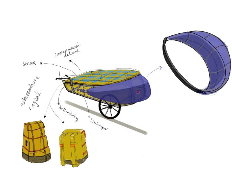 Fietskar met loadcel en zonnepaneel. De fietskar kent een modulaire opbouw met een rugzak en schoudertas.